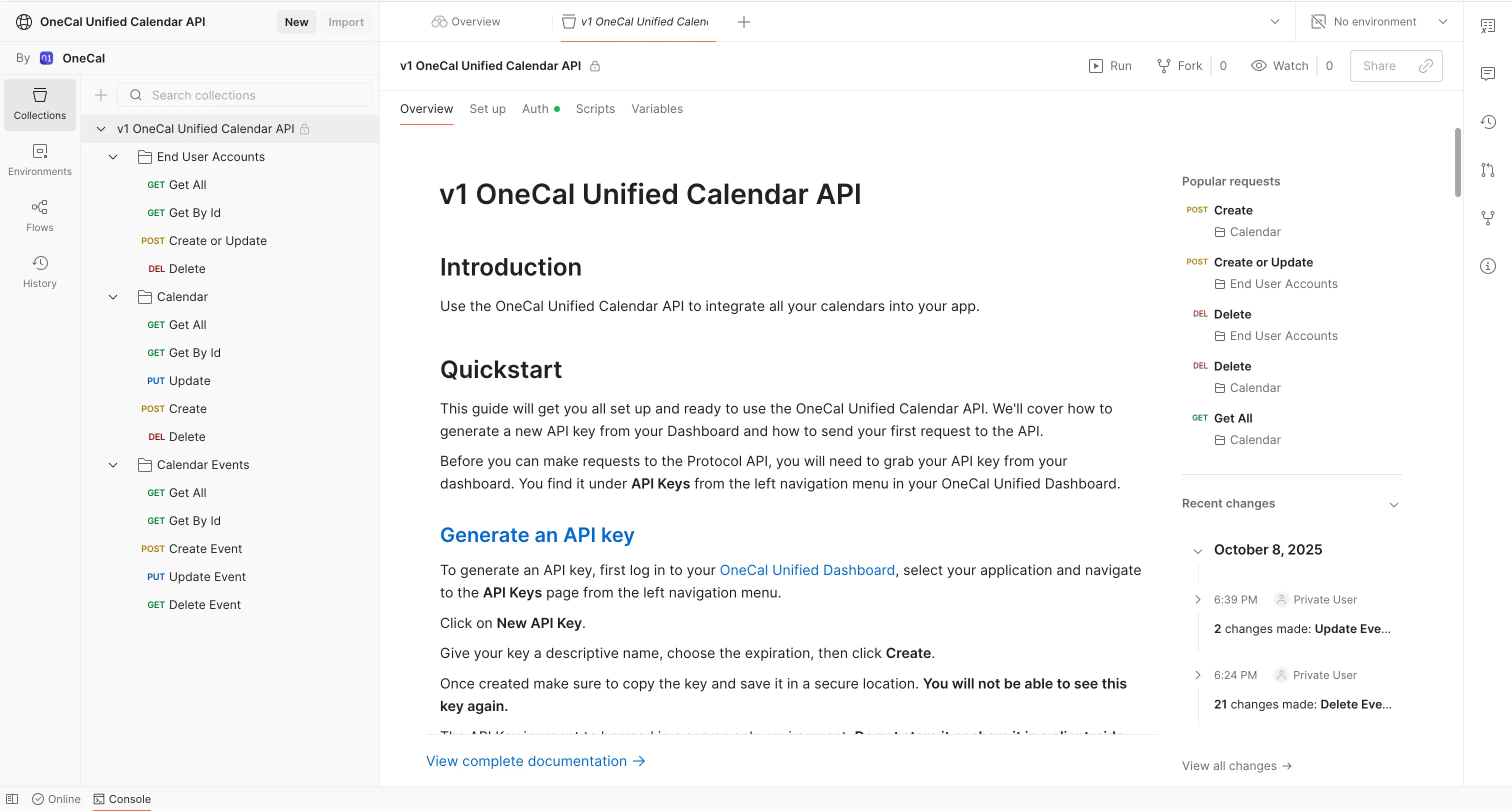Use the OneCal Unified Calendar API Postman collection to quickly start using the OneCal Unified Calendar APIs. The collection includes the following information: